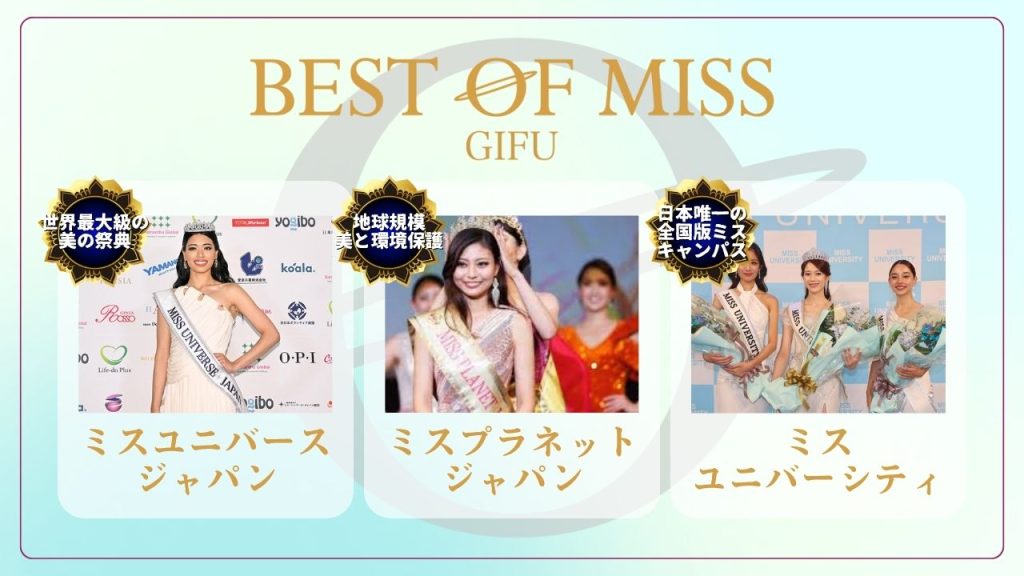 BEST OF MISS とは、「ミス・ユニバース・ジャパン」「ミス・プラネット・ジャパン」「ミス・ユニバーシティ」世界的ミスコンテストを含む 3 つの合同地方代表選考会です。それぞれの日本大会へ岐阜代表として出場する女性を各大会ごとに一名、岐阜から複数名の代表を選出することができます。